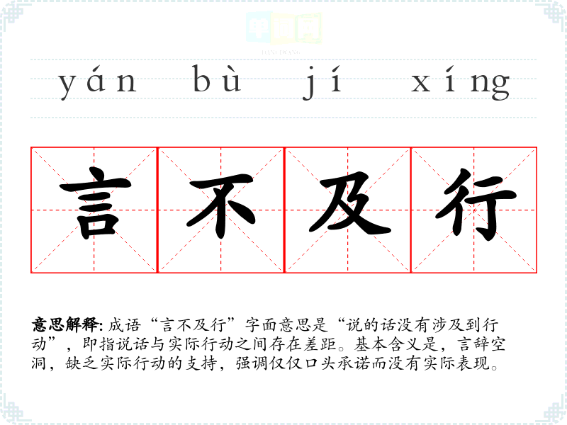 成语“言不及行”字面意思是“说的话没有涉及到行动”,即指说话与实际行动之间存在差距。基本含义是,言辞空洞,缺乏实际行动的支持,强调仅仅口头承诺而没有实际表现。