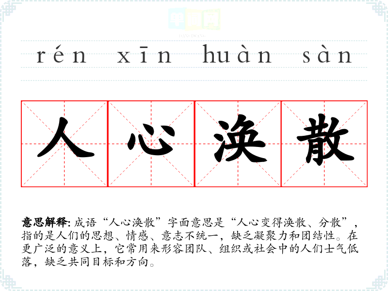 成语“人心涣散”字面意思是“人心变得涣散、分散”,指的是人们的思想、情感、意志不统一,缺乏凝聚力和团结性。在更广泛的意义上,它常用来形容团队、组织或社会中的人们士气低落,缺乏共同目标和方向。