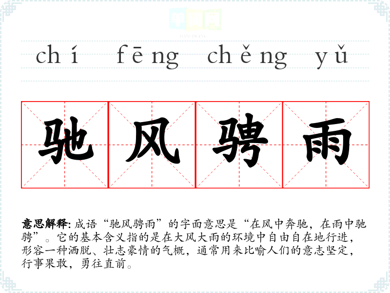 成语“驰风骋雨”的字面意思是“在风中奔驰,在雨中驰骋”。它的基本含义指的是在大风大雨的环境中自由自在地行进,形容一种洒脱、壮志豪情的气概,通常用来比喻人们的意志坚定,行事果敢,勇往直前。