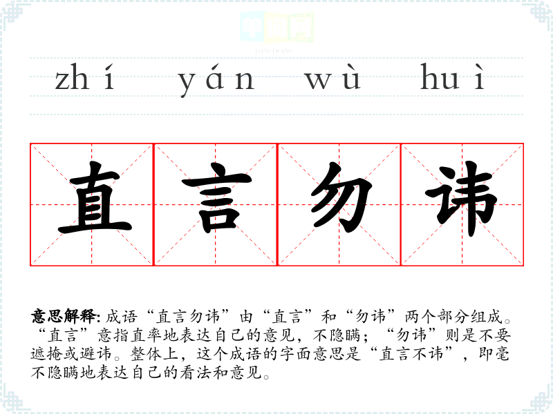 成语“直言勿讳”由“直言”和“勿讳”两个部分组成。“直言”意指直率地表达自己的意见,不隐瞒;“勿讳”则是不要遮掩或避讳。整体上,这个成语的字面意思是“直言不讳”,即毫不隐瞒地表达自己的看法和意见。