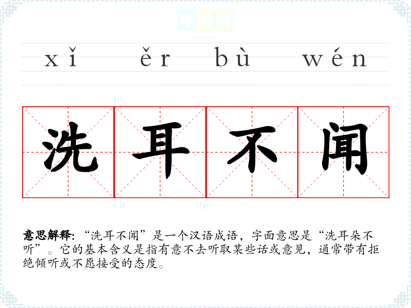 “洗耳不闻”是一个汉语成语,字面意思是“洗耳朵不听”。它的基本含义是指有意不去听取某些话或意见,通常带有拒绝倾听或不愿接受的态度。