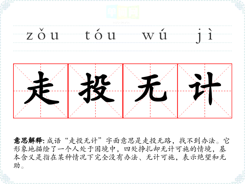成语“走投无计”字面意思是走投无路,找不到办法。它形象地描绘了一个人处于困境中,四处挣扎却无计可施的情境,基本含义是指在某种情况下完全没有办法、无计可施,表示绝望和无助。