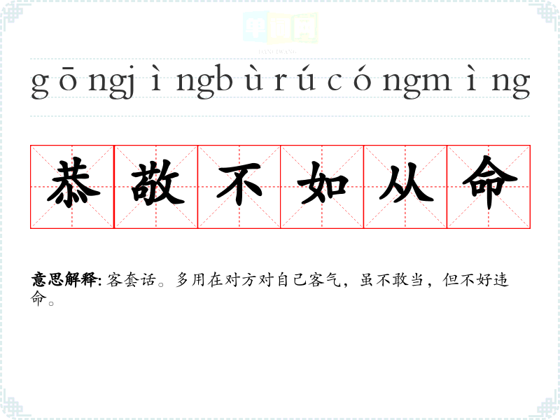 | 恭敬不如从命 | 客套话。多用在对方对自己客气,虽不敢当,但不好违命。 |