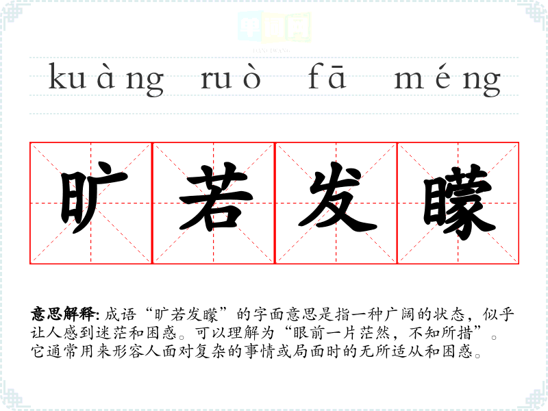 成语“旷若发矇”的字面意思是指一种广阔的状态,似乎让人感到迷茫和困惑。可以理解为“眼前一片茫然,不知所措”。它通常用来形容人面对复杂的事情或局面时的无所适从和困惑。