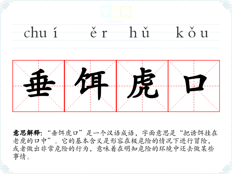 在**文化中,成语往往蕴含深厚的智慧和教训。“垂饵虎口”提醒人们在面对风险时要保持警惕,尤其在现代社会,生活中充满了各种不确定性,这个成语依然具有很强的现实意义,尤其在商业决策、投资等领域。
