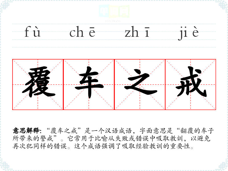 “覆车之戒”是一个汉语成语,字面意思是“翻覆的车子所带来的警戒”。它常用于比喻从失败或错误中吸取教训,以避免再次犯同样的错误。这个成语强调了吸取经验教训的重要性。