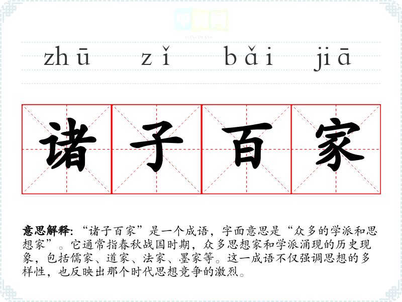 “诸子百家”是一个成语,字面意思是“众多的学派和思想家”。它通常指春秋战国时期,众多思想家和学派涌现的历史现象,包括儒家、道家、法家、墨家等。这一成语不仅强调思想的多样性,也反映出那个时代思想竞争的激烈。