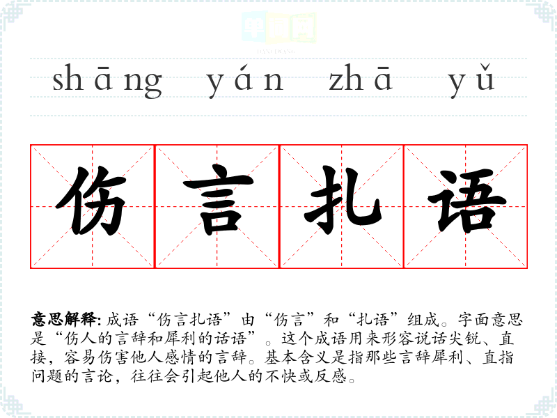 成语“伤言扎语”由“伤言”和“扎语”组成。字面意思是“伤人的言辞和犀利的话语”。这个成语用来形容说话尖锐、直接,容易伤害他人感情的言辞。基本含义是指那些言辞犀利、直指问题的言论,往往会引起他人的不快或反感。