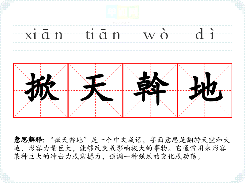“掀天斡地”是一个中文成语,字面意思是翻转天空和大地,形容力量巨大,能够改变或影响极大的事物。它通常用来形容某种巨大的冲击力或震撼力,强调一种强烈的变化或动荡。