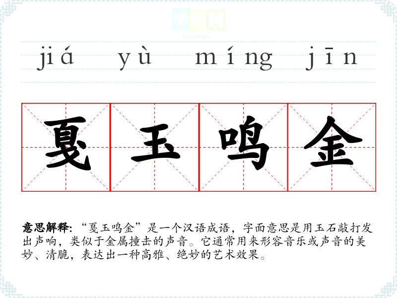 “戛玉鸣金”是一个汉语成语,字面意思是用玉石敲打发出声响,类似于金属撞击的声音。它通常用来形容音乐或声音的美妙、清脆,表达出一种高雅、绝妙的艺术效果。