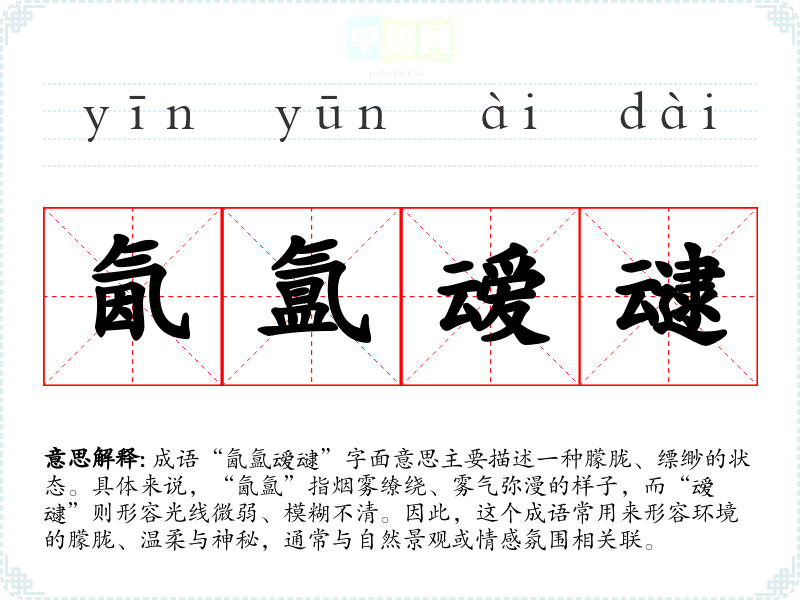 成语“氤氲叆叇”字面意思主要描述一种朦胧、缥缈的状态。具体来说,“氤氲”指烟雾缭绕、雾气弥漫的样子,而“叆叇”则形容光线微弱、模糊不清。因此,这个成语常用来形容环境的朦胧、温柔与神秘,通常与自然景观或情感氛围相关联。