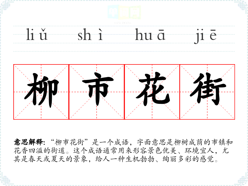 在**文化中,柳树和花朵通常与春天和生命有关,象征着希望与美好。因此,“柳市花街”不仅是对自然景色的描绘,也反映了人们对美好生活的向往。在现代社会,这个成语仍然适用于形容那些充满生机和活力的场景,体现了人们对自然和生活的热爱。