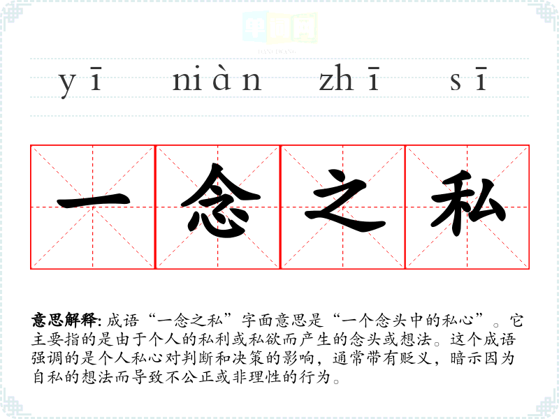 成语“一念之私”字面意思是“一个念头中的私心”。它主要指的是由于个人的私利或私欲而产生的念头或想法。这个成语强调的是个人私心对判断和决策的影响,通常带有贬义,暗示因为自私的想法而导致不公正或非理性的行为。