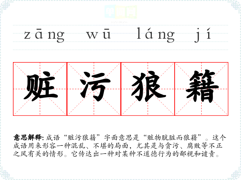 成语“赃污狼籍”字面意思是“赃物肮脏而狼藉”。这个成语用来形容一种混乱、不堪的局面,尤其是与贪污、腐败等不正之风有关的情形。它传达出一种对某种不道德行为的鄙视和谴责。