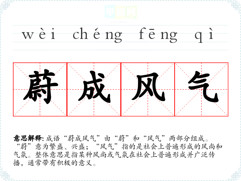 成语“蔚成风气”由“蔚”和“风气”两部分组成。“蔚”意为繁盛、兴盛;“风气”指的是社会上普遍形成的风尚和气氛。整体意思是指某种风尚或气氛在社会上普遍形成并广泛传播,通常带有积极的意义。