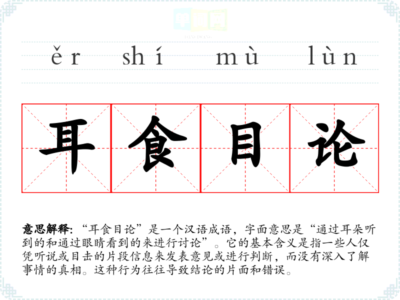 “耳食目论”是一个汉语成语,字面意思是“通过耳朵听到的和通过眼睛看到的来进行讨论”。它的基本含义是指一些人仅凭听说或目击的片段信息来发表意见或进行判断,而没有深入了解事情的真相。这种行为往往导致结论的片面和错误。