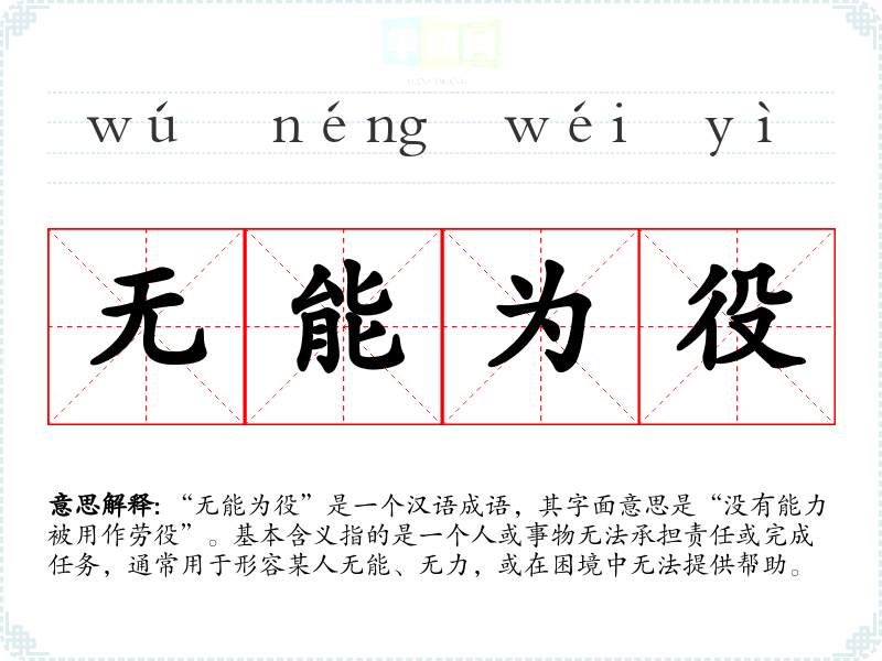 “无能为役”是一个汉语成语,其字面意思是“没有能力被用作劳役”。基本含义指的是一个人或事物无法承担责任或完成任务,通常用于形容某人无能、无力,或在困境中无法提供帮助。