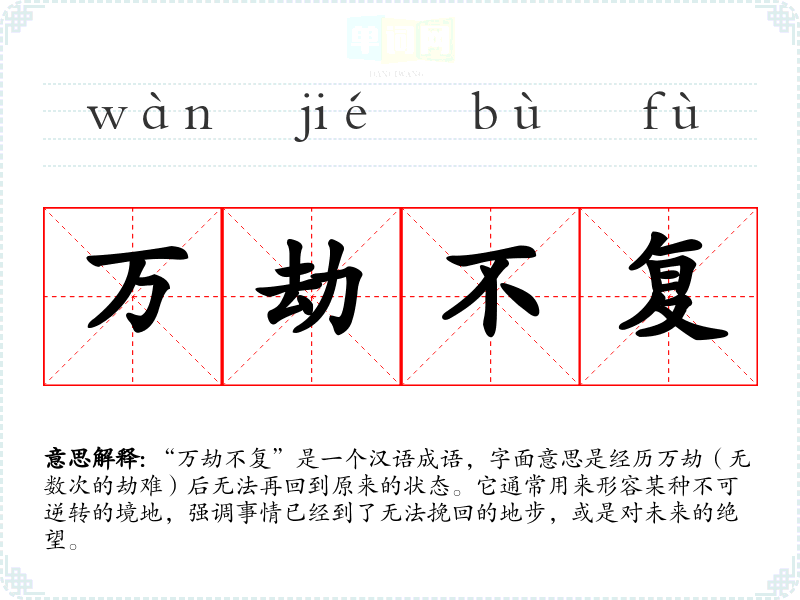 “万劫不复”是一个汉语成语,字面意思是经历万劫(无数次的劫难)后无法再回到原来的状态。它通常用来形容某种不可逆转的境地,强调事情已经到了无法挽回的地步,或是对未来的绝望。