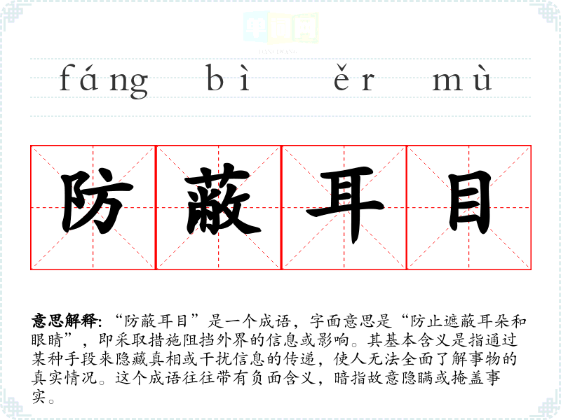- 遮人耳目:意指故意隐藏真相,让他人无法知晓事情的真相。与“防蔽耳目”相似,但更强调对他人感知的直接影响。