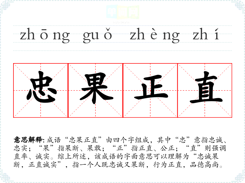 成语“忠果正直”由四个字组成,其中“忠”意指忠诚、忠实;“果”指果断、果敢;“正”指正直、公正;“直”则强调直率、诚实。综上所述,该成语的字面意思可以理解为“忠诚果断,正直诚实”,指一个人既忠诚又果断,行为正直,品德高尚。