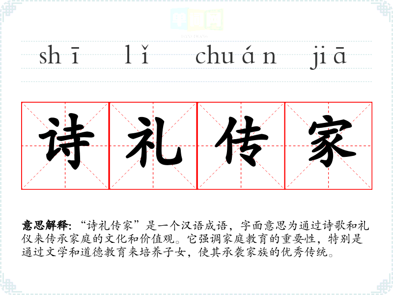 “诗礼传家”是一个汉语成语,字面意思为通过诗歌和礼仪来传承家庭的文化和价值观。它强调家庭教育的重要性,特别是通过文学和道德教育来培养子女,使其承袭家族的优秀传统。