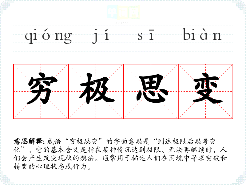 成语“穷极思变”的字面意思是“到达极限后思考变化”。它的基本含义是指在某种情况达到极限、无法再继续时,人们会产生改变现状的想法。通常用于描述人们在困境中寻求突破和转变的心理状态或行为。
