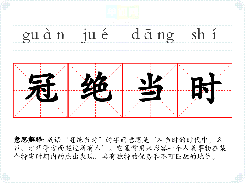 成语“冠绝当时”的字面意思是“在当时的时代中,名声、才华等方面超过所有人”。它通常用来形容一个人或事物在某个特定时期内的杰出表现,具有独特的优势和不可匹敌的地位。