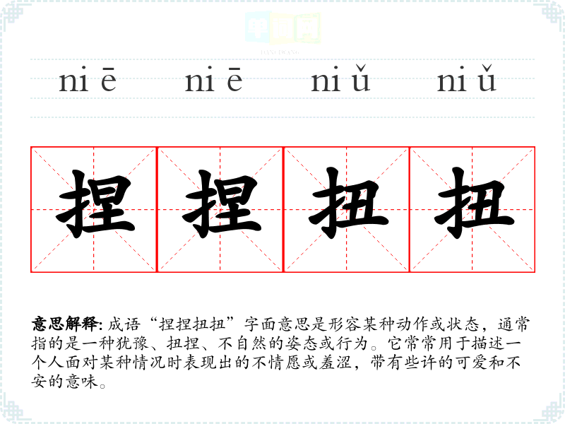 成语“捏捏扭扭”字面意思是形容某种动作或状态,通常指的是一种犹豫、扭捏、不自然的姿态或行为。它常常用于描述一个人面对某种情况时表现出的不情愿或羞涩,带有些许的可爱和不安的意味。