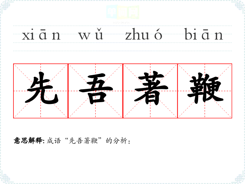 “先吾著鞭”字面意思是“先让我来拿鞭子”,通常用来比喻在某个事情中,首先要自己动手或亲自行动。其基本含义是强调自己主动出击、带头行动的重要性。