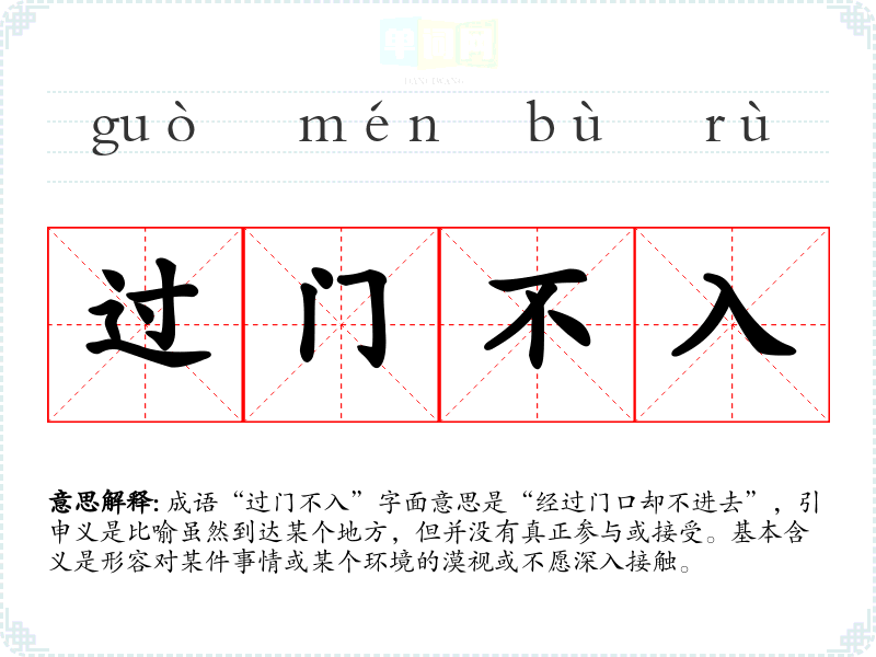 成语“过门不入”字面意思是“经过门口却不进去”,引申义是比喻虽然到达某个地方,但并没有真正参与或接受。基本含义是形容对某件事情或某个环境的漠视或不愿深入接触。