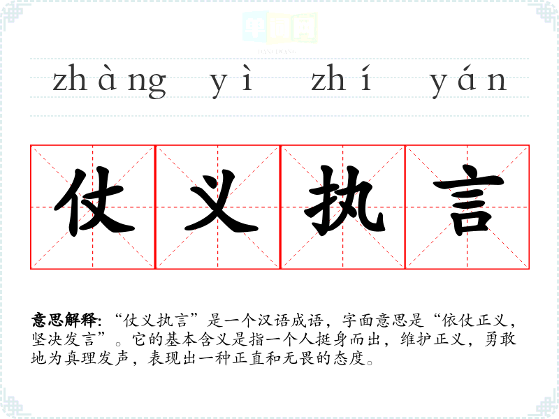 “仗义执言”是一个汉语成语,字面意思是“依仗正义,坚决发言”。它的基本含义是指一个人挺身而出,维护正义,勇敢地为真理发声,表现出一种正直和无畏的态度。