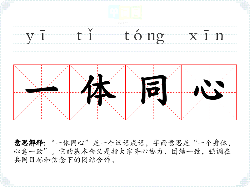 “一体同心”是一个汉语成语,字面意思是“一个身体,心意一致”。它的基本含义是指大家齐心协力、团结一致,强调在共同目标和信念下的团结合作。