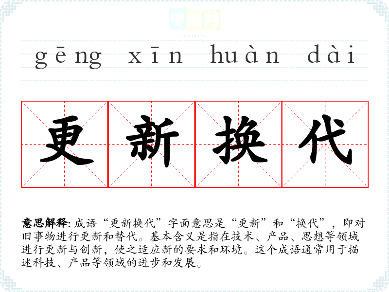 成语“更新换代”字面意思是“更新”和“换代”,即对旧事物进行更新和替代。基本含义是指在技术、产品、思想等领域进行更新与创新,使之适应新的要求和环境。这个成语通常用于描述科技、产品等领域的进步和发展。