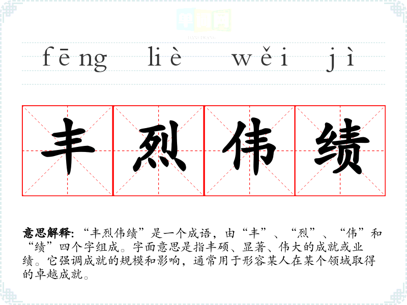 | 丰烈伟绩 | 丰:多;烈:功业;伟:大,显赫。伟大的功绩和成就。 |