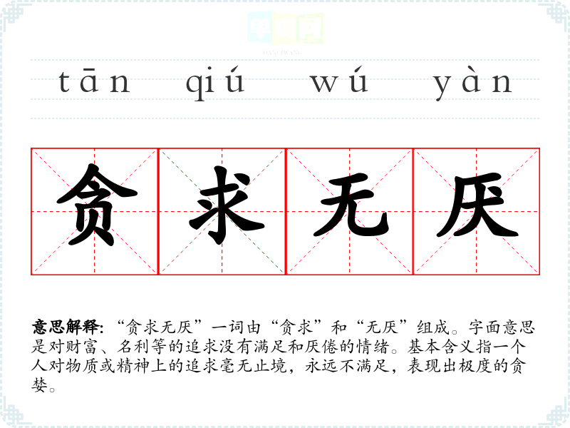 “贪求无厌”一词由“贪求”和“无厌”组成。字面意思是对财富、名利等的追求没有满足和厌倦的情绪。基本含义指一个人对物质或精神上的追求毫无止境,永远不满足,表现出极度的贪婪。