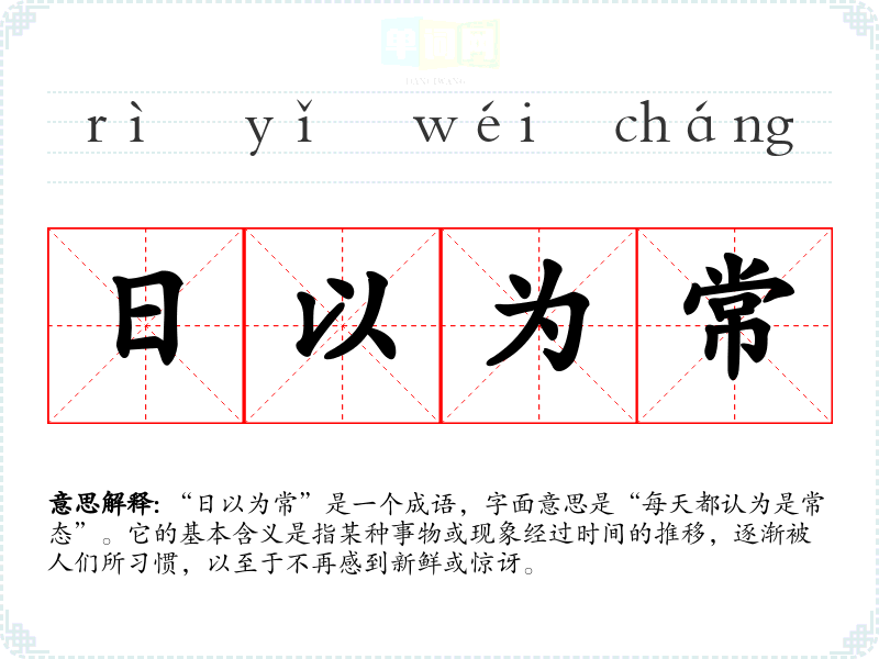“日以为常”出自《后汉书·光武帝纪》,原文是:“日以为常,久之而不觉。”该成语反映了人们对日常生活中某些事情变得习以为常的状态。这个成语强调了时间的积累和人们适应性。