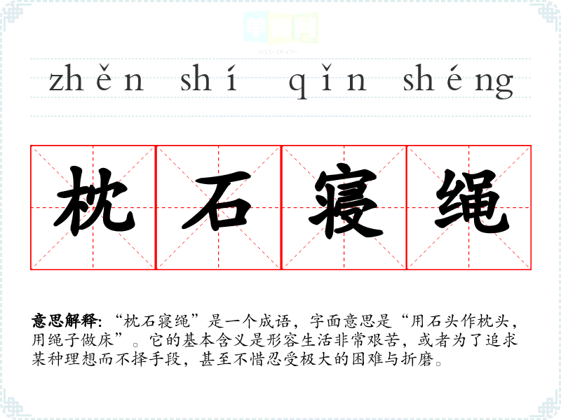 “枕石寝绳”是一个成语,字面意思是“用石头作枕头,用绳子做床”。它的基本含义是形容生活非常艰苦,或者为了追求某种理想而不择手段,甚至不惜忍受极大的困难与折磨。