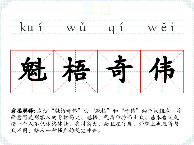 成语“魁梧奇伟”由“魁梧”和“奇伟”两个词组成。字面意思是形容人的身材高大、魁梧,气质独特而出众。基本含义是指一个人不仅体格健壮、身材高大,而且在气度、外貌上也显得与众不同,给人一种强烈的视觉冲击。