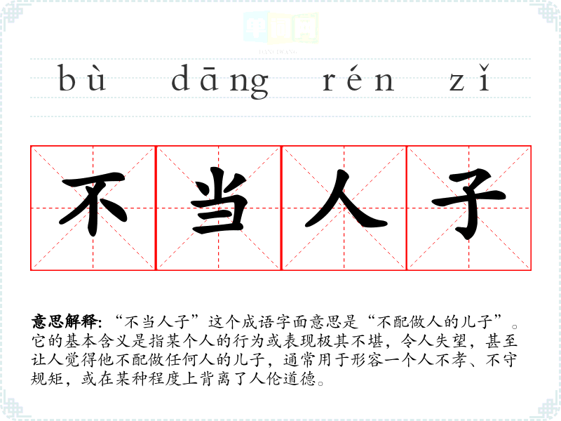“不当人子”这个成语字面意思是“不配做人的儿子”。它的基本含义是指某个人的行为或表现极其不堪,令人失望,甚至让人觉得他不配做任何人的儿子,通常用于形容一个人不孝、不守规矩,或在某种程度上背离了人伦道德。