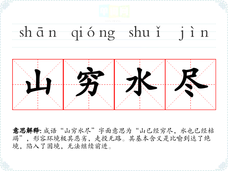 成语“山穷水尽”字面意思为“山已经穷尽,水也已经枯竭”,形容环境极其恶劣,走投无路。其基本含义是比喻到达了绝境,陷入了困境,无法继续前进。