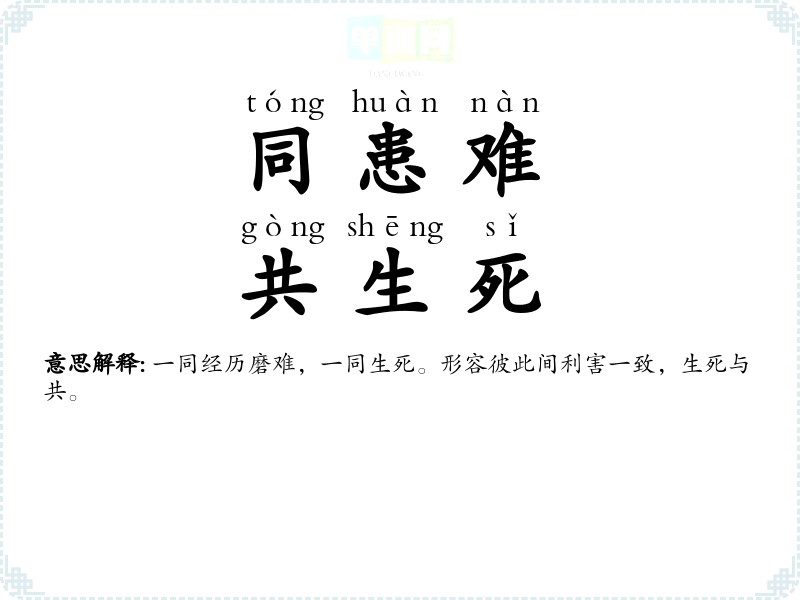 | 同休共戚 | ①指同欢乐共忧患。形容关系密切,利害一致。②偏指共患难。亦作“同休等戚”。 |