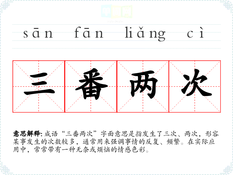 成语“三番两次”字面意思是指发生了三次、两次,形容某事发生的次数较多,通常用来强调事情的反复、频繁。在实际应用中,常常带有一种无奈或烦恼的情感色彩。