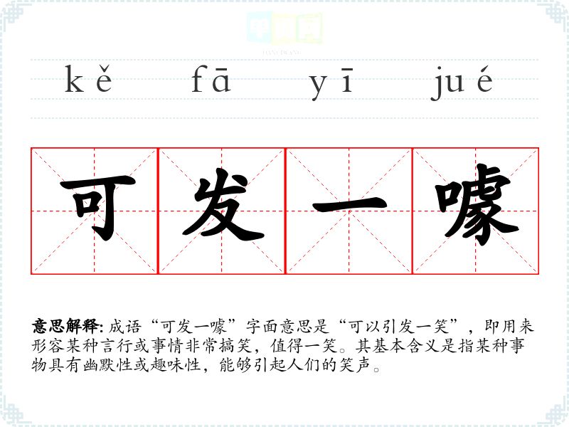 成语“可发一噱”字面意思是“可以引发一笑”,即用来形容某种言行或事情非常搞笑,值得一笑。其基本含义是指某种事物具有幽默性或趣味性,能够引起人们的笑声。