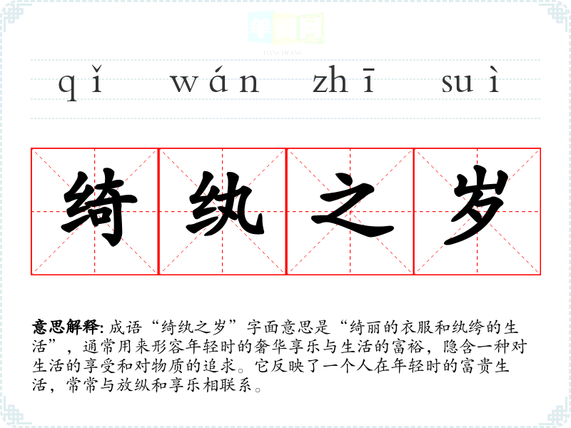 成语“绮纨之岁”字面意思是“绮丽的衣服和纨绔的生活”,通常用来形容年轻时的奢华享乐与生活的富裕,隐含一种对生活的享受和对物质的追求。它反映了一个人在年轻时的富贵生活,常常与放纵和享乐相联系。