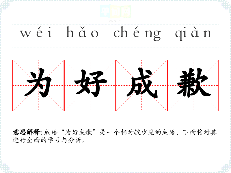 “为好成歉”字面意思是:因为好意而造成了歉意。它反映了一种常见的社会现象,即出于好心的行为或举动,最终却导致了他人的误解或不快。这个成语传达了一个重要的道理:善意的行为并不总能得到预期的效果,有时甚至会适得其反。