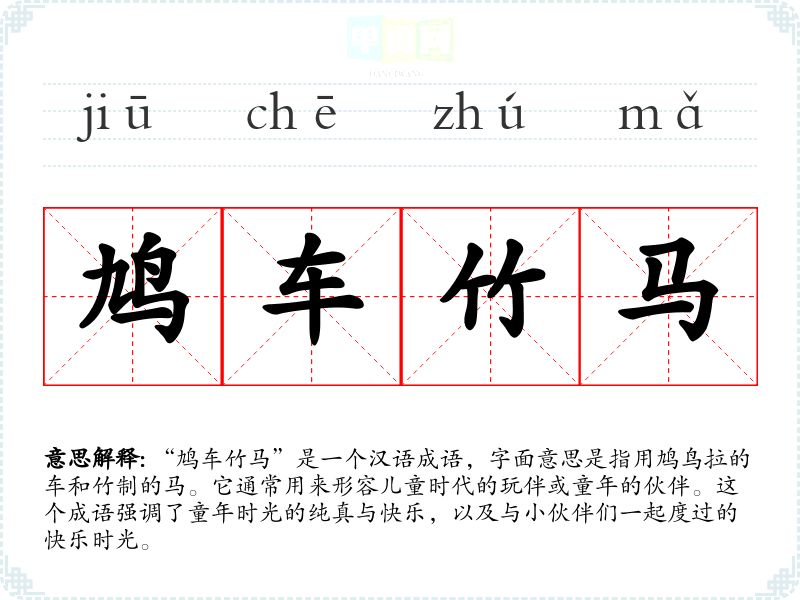 “鸠车竹马”是一个汉语成语,字面意思是指用鸠鸟拉的车和竹制的马。它通常用来形容儿童时代的玩伴或童年的伙伴。这个成语强调了童年时光的纯真与快乐,以及与小伙伴们一起度过的快乐时光。