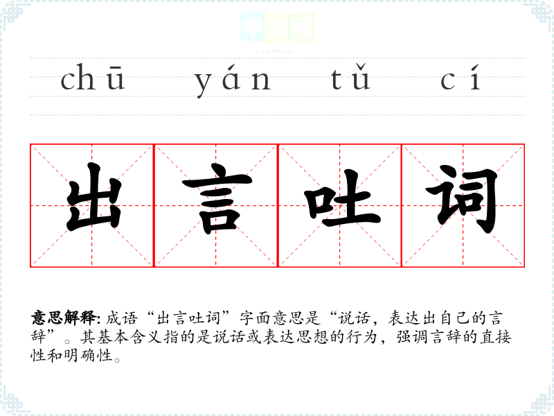 成语“出言吐词”字面意思是“说话,表达出自己的言辞”。其基本含义指的是说话或表达思想的行为,强调言辞的直接性和明确性。