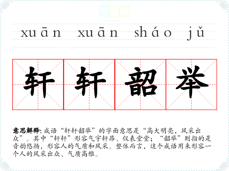 成语“轩轩韶举”的字面意思是“高大明亮,风采出众”。其中“轩轩”形容气宇轩昂、仪表堂堂;“韶举”则指的是音韵悠扬,形容人的气质和风采。整体而言,这个成语用来形容一个人的风采出众、气质高雅。