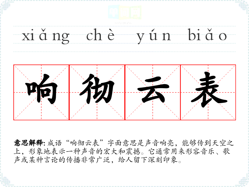 成语“响彻云表”字面意思是声音响亮,能够传到天空之上,形象地表示一种声音的宏大和震撼。它通常用来形容音乐、歌声或某种言论的传播非常广泛,给人留下深刻印象。