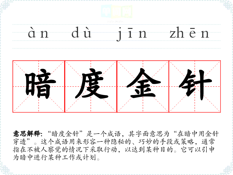 “暗度金针”是一个成语,其字面意思为“在暗中用金针穿透”。这个成语用来形容一种隐秘的、巧妙的手段或策略,通常指在不被人察觉的情况下采取行动,以达到某种目的。它可以引申为暗中进行某种工作或计划。